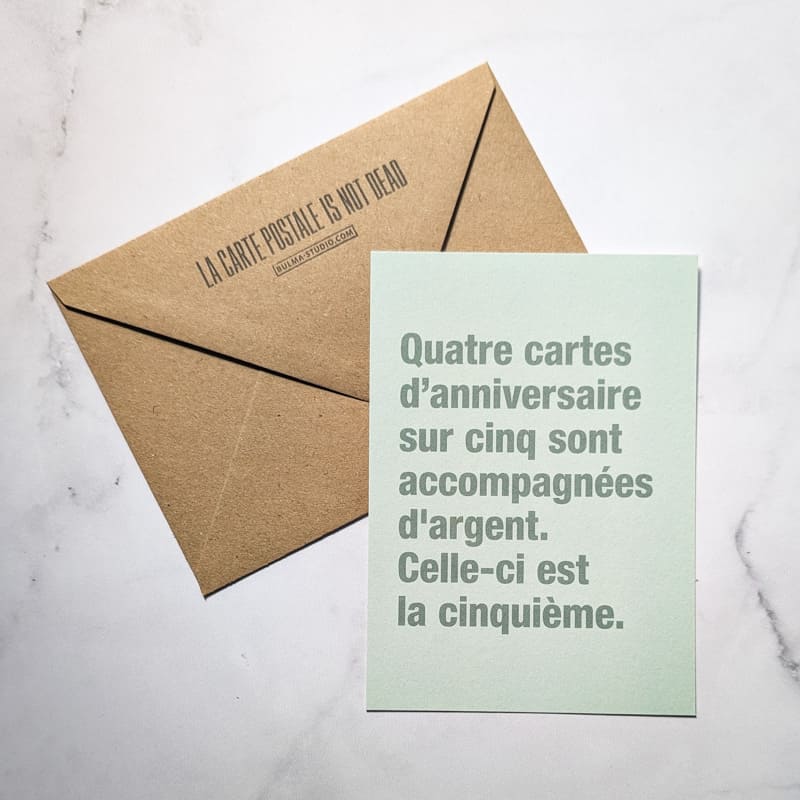 Retrouvez dans notre boutique à Chambéry les cartes postales humoristiques Bulma Shop, made in Besançon pour toutes les occasions : mariage, anniversaire, déclaration d’amour et bien plus encore.